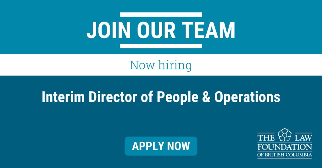 We are seeking an experienced Interim Director of People & Operations to join our team! This is a full-time, fixed term position (12 to 18 month parental leave coverage). For more information on this position, please see the full posting on the Foundation’s hiring portal: https://lawfoundationbc.bamboohr.com/careers/65
